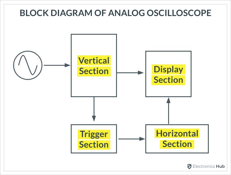 上框圖中的垂直部分負責將主圖像發(fā)送到CRT的垂直偏轉板。垂直部分放大或衰減輸入信號。水平部分負責電子束從左到右的運動。觸發(fā)部分確定何時在CRT上繪制波形。
