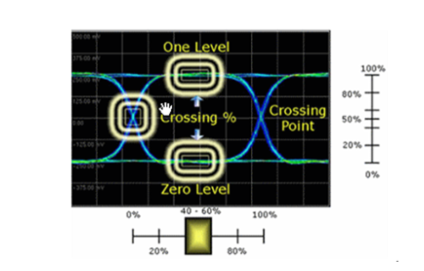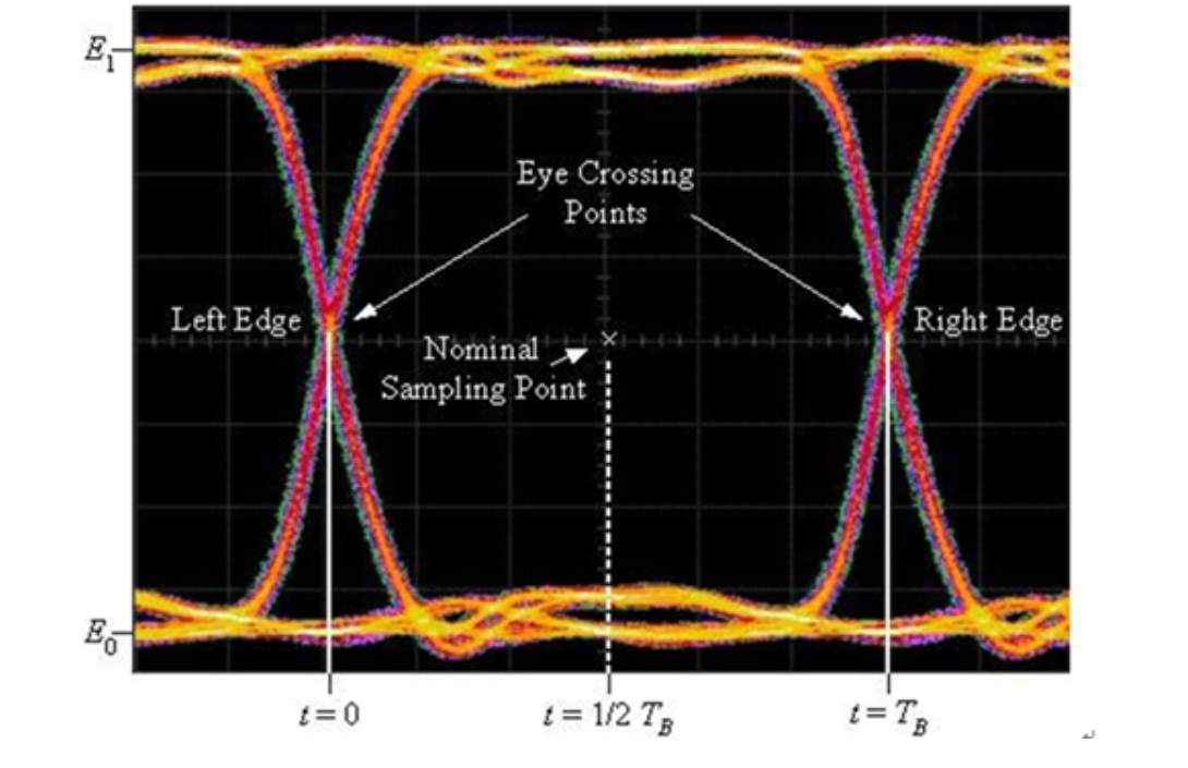 “眼寬”反映信號的總抖動,即是眼圖在水平軸所開的大小,其定義為兩上緣與下緣交匯的點(diǎn)(Crossing Point)間的時間差。