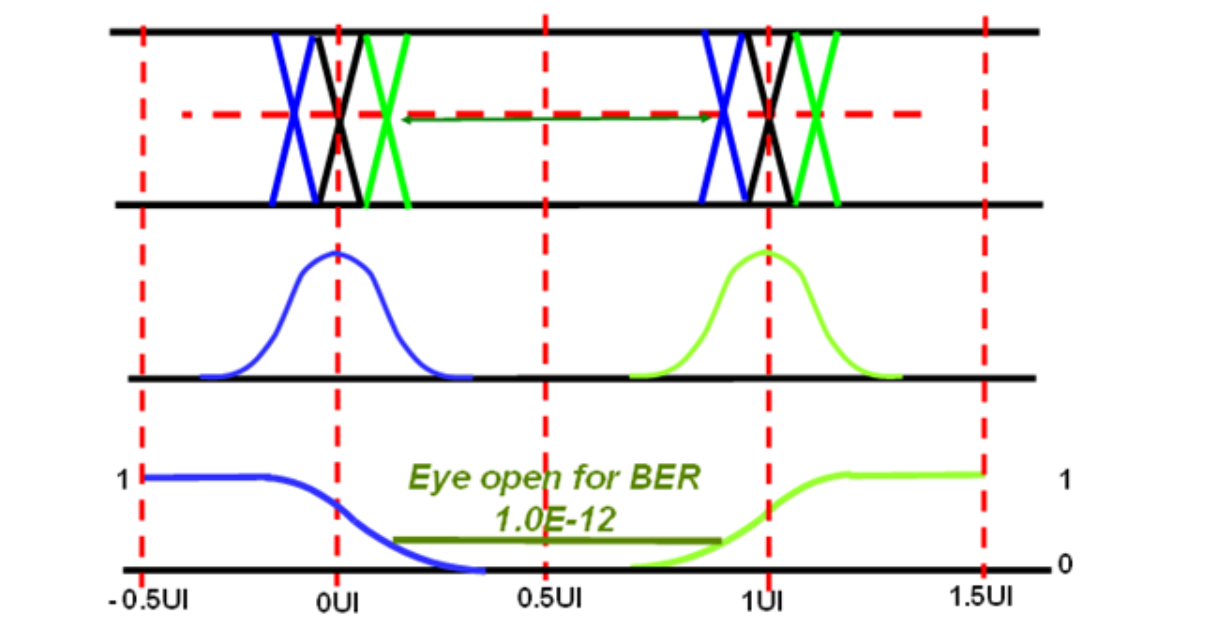 上述兩圖中,BER圖與眼圖時間軸相同,兩側(cè)與眼圖邊沿相對應(yīng),樣點(diǎn)位于中心。BER一定時,曲線之間的距離是該BER上的眼圖張開程度。在樣點(diǎn)接近交點(diǎn)時,抖動會導(dǎo)致BER提高到最大0.5。
