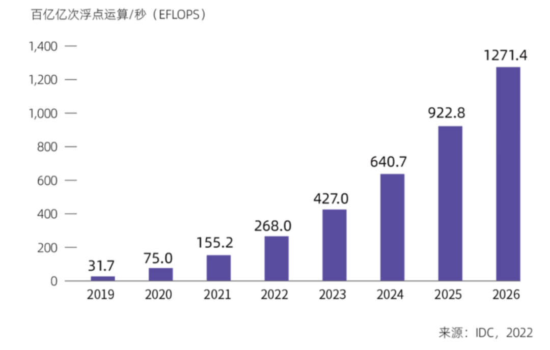 IDC數(shù)據(jù)顯示,2022年我國智能算力規(guī)模達到268 EFLOPS,超過通用算力規(guī)模。預(yù)計未來五年,我國智能算力規(guī)模的年復(fù)合增長率將達52.3%,超出同期通用算力規(guī)模18.5%的年復(fù)合增長率,到2026年,我國智能算力規(guī)模將達到1271.4EFLOPS。