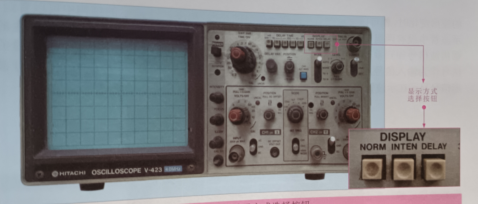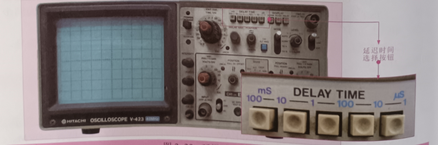 接地端:測(cè)量信號(hào)波形時(shí)要將地線與被測(cè)設(shè)備的地線連接在一起,掃描線傾斜調(diào)整 (TRACE ROTATION): 調(diào)整掃描線的水平方向,內(nèi)觸發(fā)切換開關(guān)(CH1-CH2 VERTMODE):設(shè)定內(nèi)部觸發(fā)方式,延遲時(shí)間選擇按鈕(DELAYTIME):設(shè)置5個(gè)延遲時(shí)間擋位,如圖所示