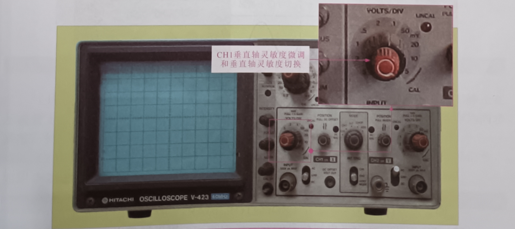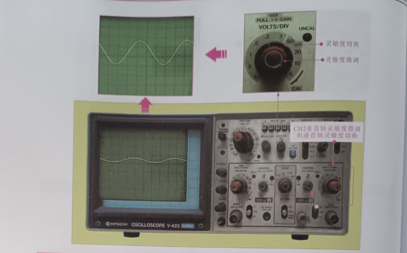 CH2 垂直軸靈敏度微調(diào) (VARIABLE) 和垂直軸靈敏度切換 (VOLTS/DIV): 用于對(duì) CH2 信號(hào)波形的垂直靈敏度進(jìn)行調(diào)整,如圖所示。