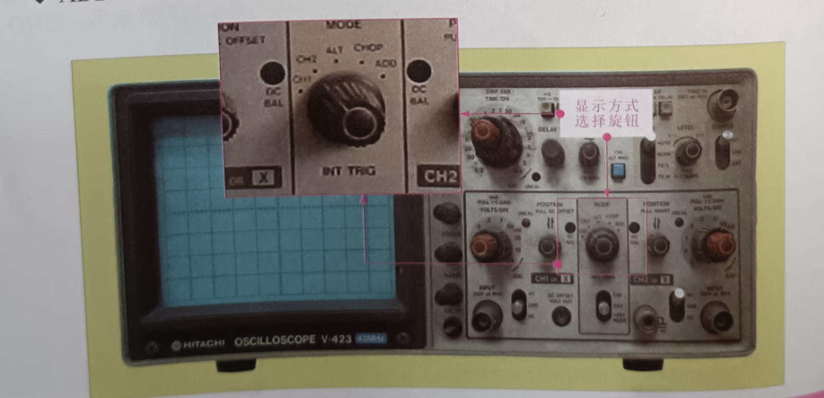 顯示方式選擇旋鈕 (MODE): 設(shè)置 CH-1、CH-2、CHOP、ALT和ADD共5個(gè)擋位,如圖 2-13 所示。