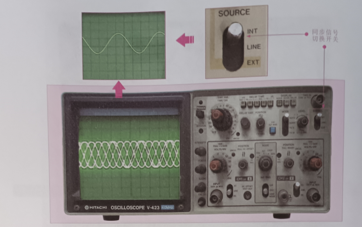 同步(觸發(fā))信號(hào)切換開關(guān) (TRIG SOURCE): 使觀測(cè)信號(hào)的波形靜止在示波管上,INT 為內(nèi)同步源,LINE 為線路輸入信號(hào),EXT 為由外部輸入信號(hào)作為同步基準(zhǔn),如圖所示。
