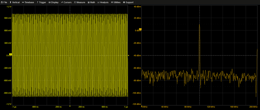 圖1.時域中的100 MHz正弦波及其頻域中的頻譜顯示了100 MHz處的一個峰值。