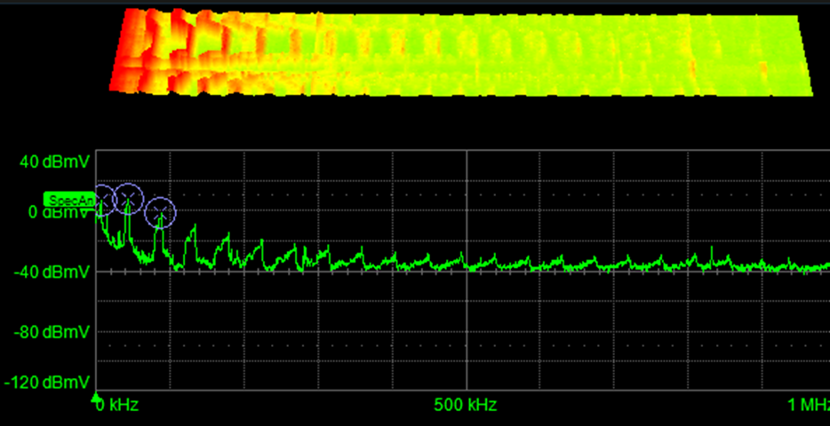 任何可能有助于識別給定頻率的周期信號的應用都是實時頻譜分析的絕佳候選者。最常見的應用是搜索重要信號的干擾源。圖4顯示了開關模式電源(SMPS)負載變化時輸出的頻譜響應。峰值約為50 kHz,開關頻率隨負載變化而隨時間變化,如圖上部的頻譜圖所示。當您在這些頻率分量中觀察放大器的噪聲或振蕩器的抖動時,您就會知道可能的根本原因。