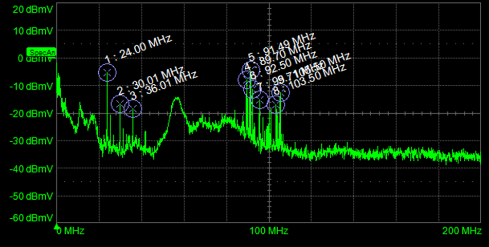 在查看RF干擾頻譜時,我們通常可以拾取特定的通信信號。圖5顯示了使用帶有大尖端環(huán)路的10倍探頭測量的USB供電設備中電源軌的實時頻譜。頻譜指紋顯示從87 MHz到108 MHz的FM無線電頻段的拾音。