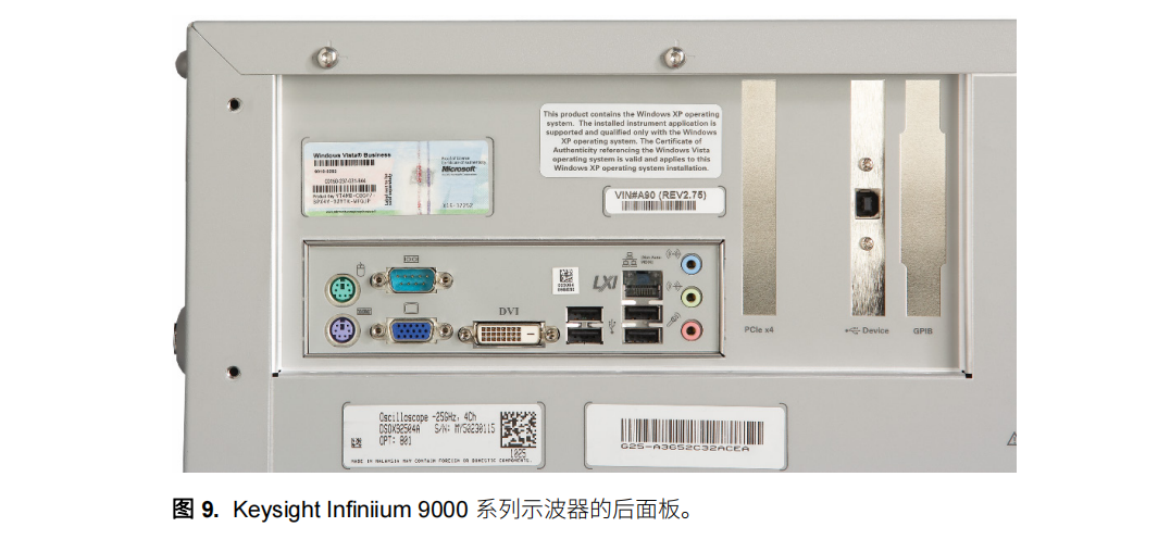您可以通過(guò)通道輸入端將信號(hào)發(fā)送到示波器,通道輸入端就是用于插入探頭的連接器。 顯示屏就是顯示這些 信號(hào)的屏幕。 水平控件和垂直控件包括旋鈕和按鈕,用于控制屏幕顯示信號(hào)的水平軸(通常表示時(shí)間)和垂 直軸(表示電壓)。 觸發(fā)控制區(qū)則讓您可以告訴示波器,您希望時(shí)基在什么條件下開(kāi)始采集。 示波器的后面板如圖 9 所示。 如您所見(jiàn),許多示波器都具有與個(gè)人計(jì)算機(jī)上一樣的連接功能。 例如 CD-ROM 驅(qū)動(dòng)器、CD-RW 驅(qū)動(dòng)器、 DVD-RW 驅(qū)動(dòng)器、USB 端口、串行端口以及外部監(jiān)視器、鼠標(biāo)和鍵盤(pán)輸入。