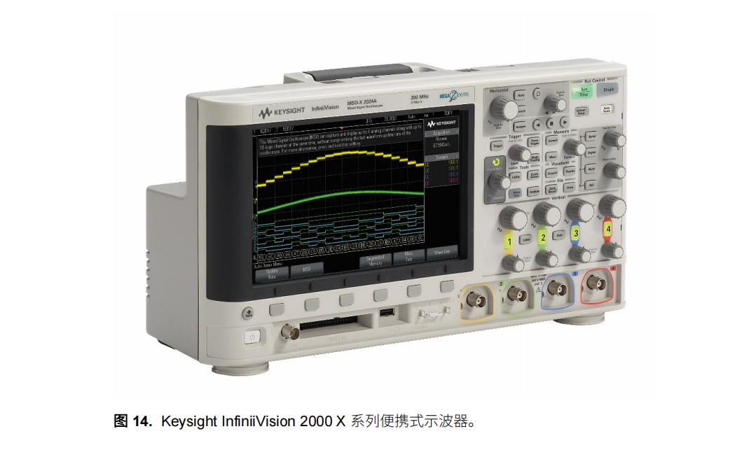 顧名思義,便攜式示波器是一種小到可以隨身攜帶的示波器。 如果您需要將示波器帶到多個地方,或者在 實驗室里從一個工作臺移動到另一個工作臺,那么便攜式示波器可能非常適合您。 14 所示的便是一臺便 攜式示波器 — Keysight InfiniiVision X 系列示波器。 便攜式示波器的優(yōu)點是重量輕、便于攜帶、開關(guān)機速度快,并且易于使用。 它們的性能往往低于大型示波 器,但 Keysight InfiniiVision 1000、2000 3000T X 系列示波器的出現(xiàn),正在改變這一點。 這些示波器具 便攜式示波器常見的所有便攜性和易用性特點,功能也足夠強大,帶寬高達 6GHz,可以應(yīng)對當今的大多 數(shù)調(diào)試需求