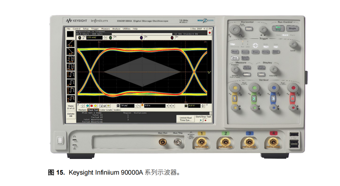 高性能示波器可提供目前最優(yōu)異的性能。 對于需要帶寬高、采樣和更新速率快、存儲器深度大和測量功能 多的示波器的用戶來說,高性能示波器是最佳選擇。 15 所示的便是一臺高性能示波器 — Keysight  Infiniium 90000A 系列示波器。 高性能示波器的主要優(yōu)點是,讓您能夠正確分析各種信號,并提供了許多應(yīng)用程序和工具,可以更簡單、 更快速地分析當前技術(shù)。 其主要缺點是價格高,體積大。