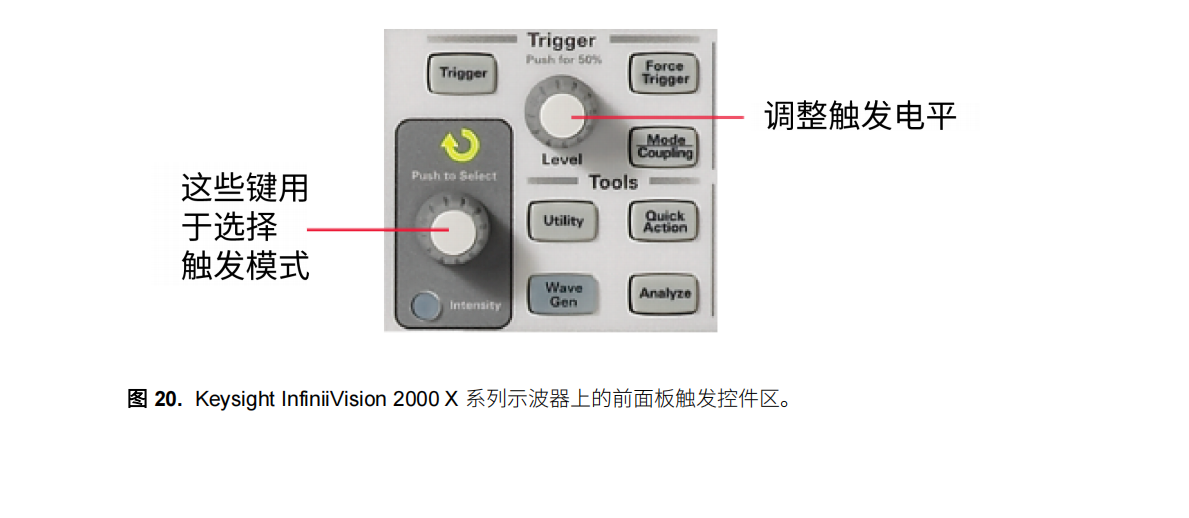 當(dāng)您需要找出特定的脈寬時,脈寬觸發(fā)與毛刺觸發(fā)功能相似。 不過,通常您可以觸發(fā)任何指定寬度的脈 沖,并且可以選擇要觸發(fā)的脈沖的極性(負(fù)或正)。 您還可以設(shè)置觸發(fā)的水平位置。 這樣一來,您就可以 看清觸發(fā)前后的情況。 例如,您可以執(zhí)行毛刺觸發(fā),找出錯誤,然后查看觸發(fā)前的信號,以確定產(chǎn)生毛刺 的原因。 如果您將水平延遲設(shè)置為零,則觸發(fā)事件將被放在屏幕水平方向的中間位置。 在觸發(fā)之前發(fā)生的 事件將位于屏幕左側(cè),而在觸發(fā)之后發(fā)生的事件則位于屏幕右側(cè)。 您還可以設(shè)置觸發(fā)耦合,并設(shè)置想要觸 發(fā)的輸入源。 您不是必須要觸發(fā)自己的信號,還可以觸發(fā)相關(guān)信號。 20 顯示了示波器前面板的觸發(fā)控 件區(qū)。