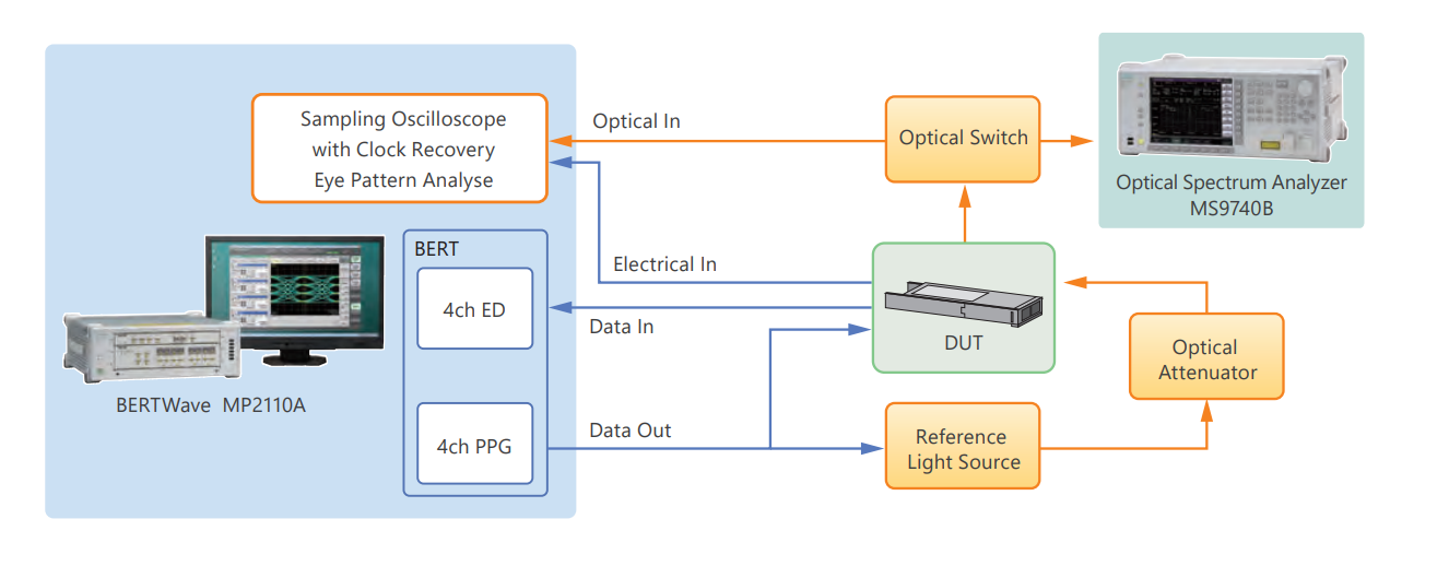 1. 將 TLS 的輸出端口連接到 PC 的輸入端口,將 PC 的輸出端口連接到 VA 的輸入端口,將 VA 的輸出端口連接到待測光纖的輸入端口,將待測光纖的輸出端口連接到 PA 的輸入端口,將 PA 的輸出端口連接到 MS9740B 的輸入端口。