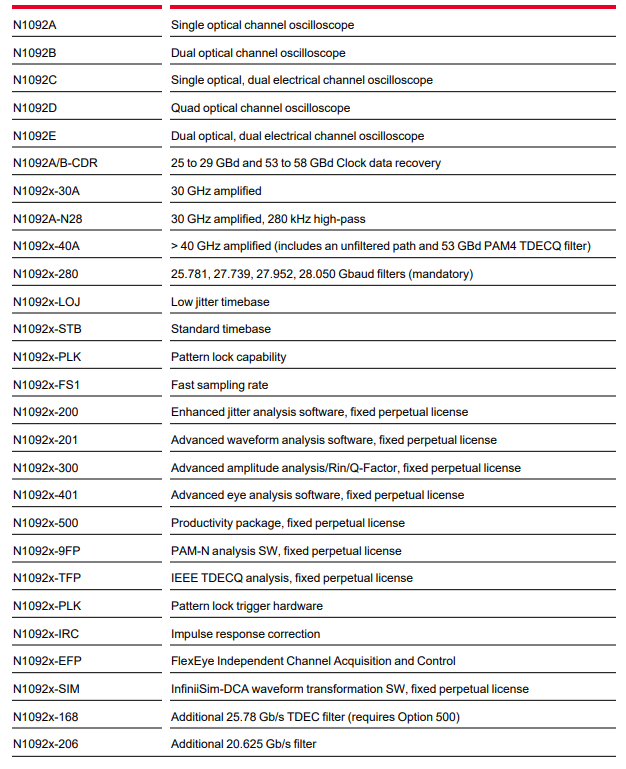 ? N1092C:一款 DCA-M 采樣示波器,配有一個光通道和兩個電通道。N1092C 適用于驗證光發(fā)射機是否符合通信標準。光通道帶寬為 >40 GHz(選件 40A)、電通道帶寬為 50 GHz。