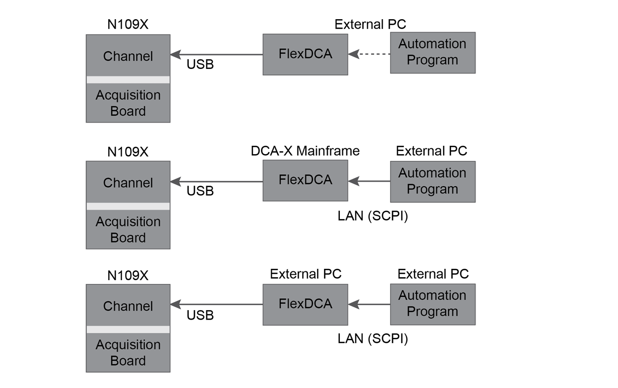 也可以用USB線將86100D或N1000A主機連接到N1092A/B/C/D/E。主機可以通過GPIB或其他方式控制,然后可以通過GPIB或LAN控制主機。