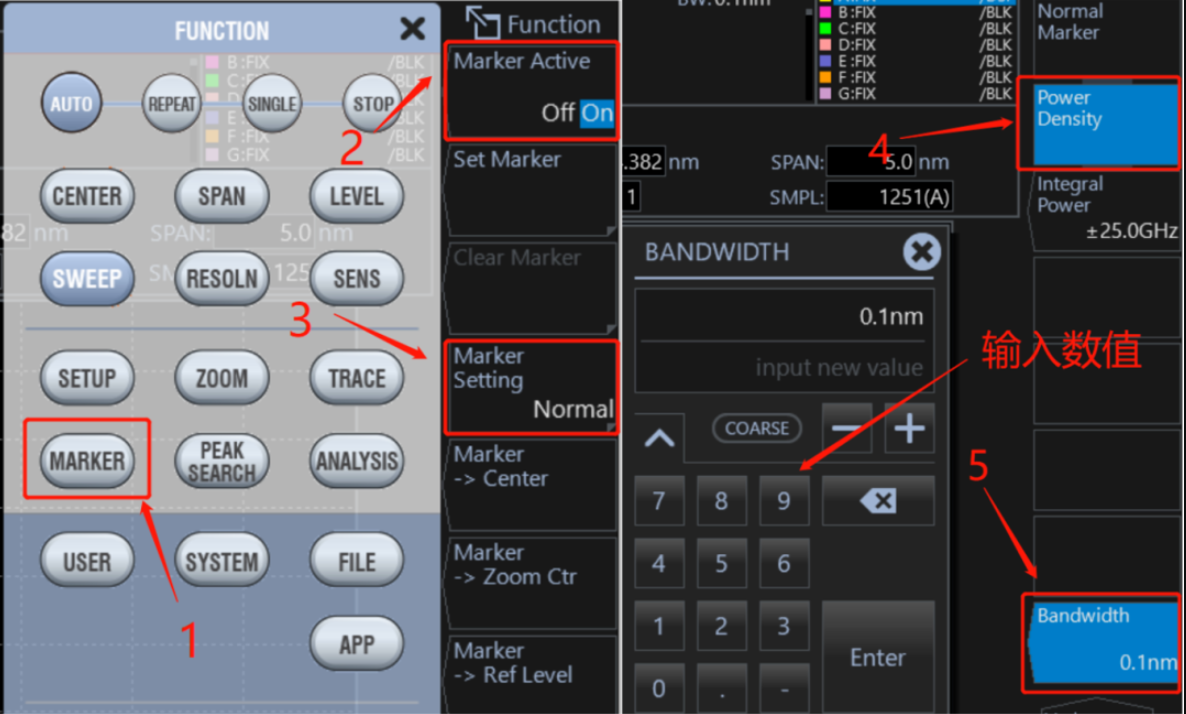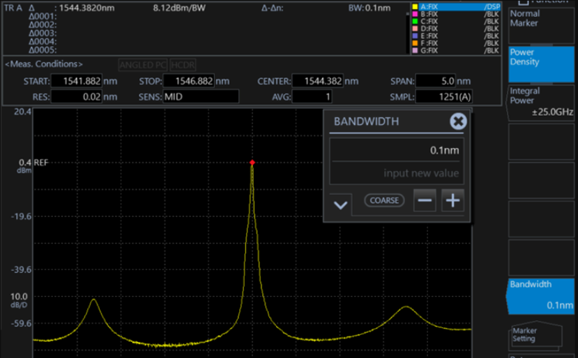 功率譜密度標記是以波形上的標記位置為中心,把每個在0.1nm ~ 10.0nm歸一化帶寬設(shè)置范圍內(nèi)的功率值顯示到數(shù)據(jù)區(qū)域的一項功能。測量信號噪聲功率的情況下,使用者便可采用這些標記計算出每個既定帶寬所對應(yīng)的功率值。
