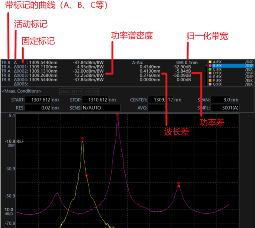 ▲光譜儀同時在多條曲線上設(shè)置多個功率譜密度標記的示意圖