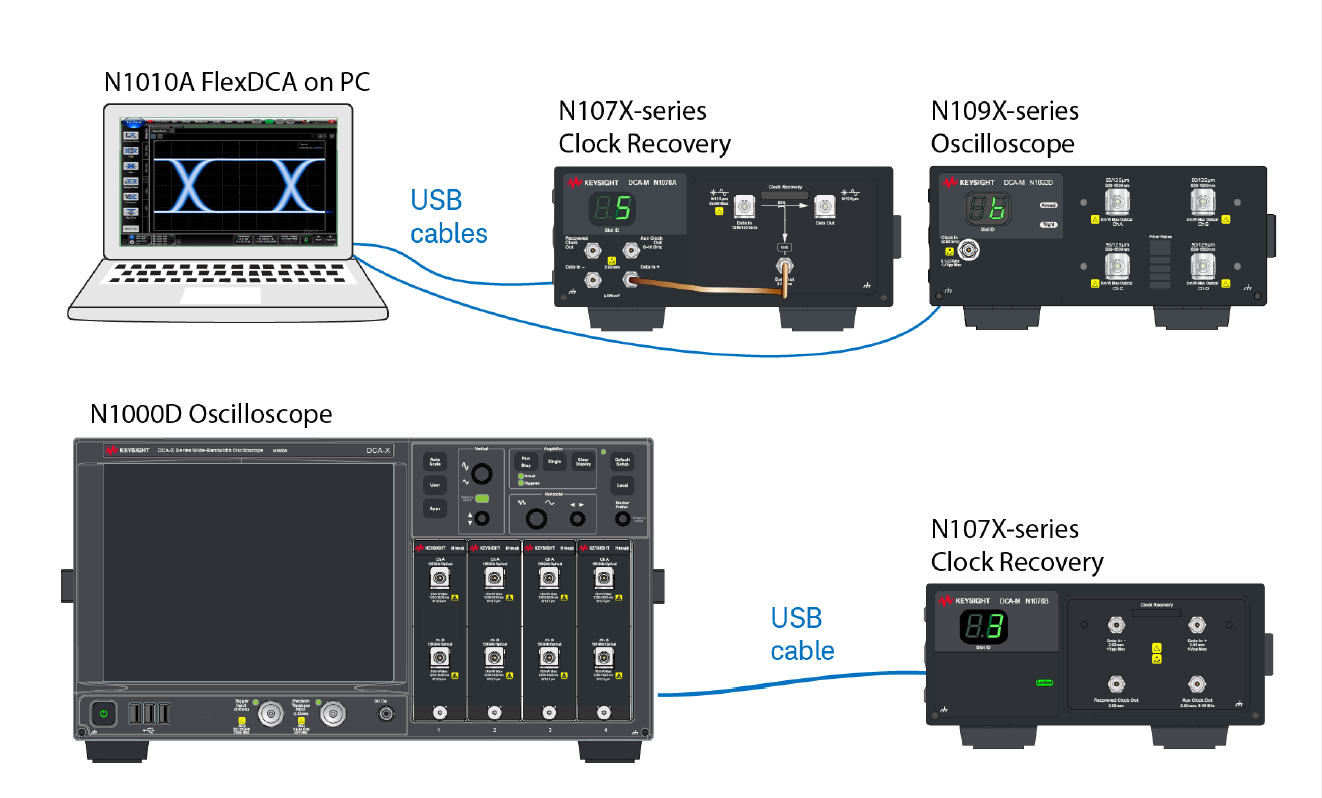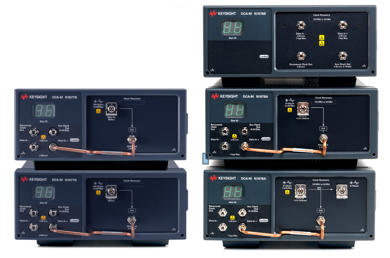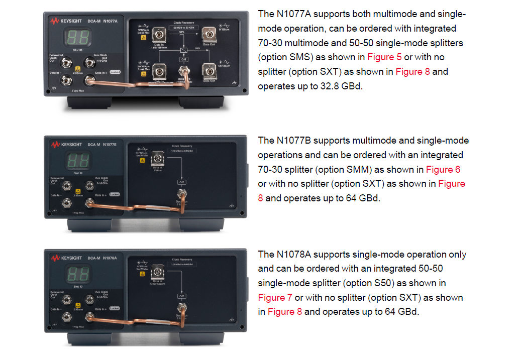 N1077A、N1077B和N1078A,并且它們都可以通過USB連接到DCA-X主機(jī)或PC上運(yùn)行FlexDCA軟件進(jìn)行控制。其中,N1077A支持多模和單模操作,可以與集成的70-30多模和50-50單模分路器一起使用,也可以不帶分路器使用;N1077B同樣支持多模和單模操作,可選配70-30分路器或不帶分路器;而N1078A只支持單模操作,可選配50-50單模分路器或不帶分路器。這三款儀器均能從高速光通信信號中準(zhǔn)確地恢復(fù)時(shí)鐘信號,適用于各種數(shù)據(jù)速率高達(dá)64GBd的信號類型。