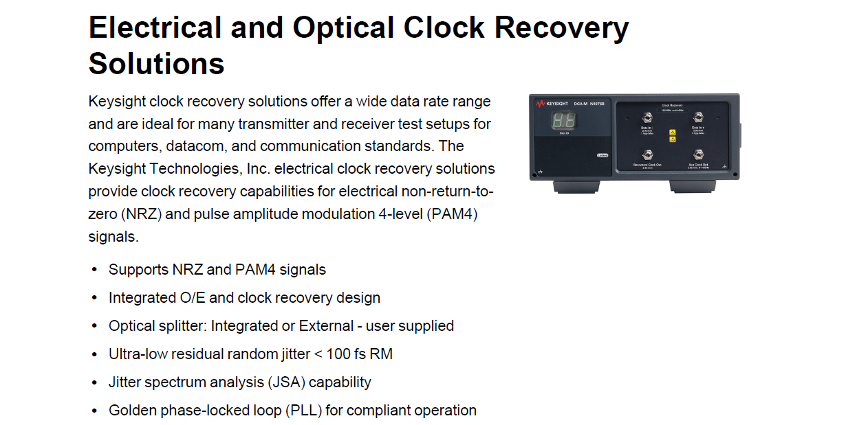 • Keysight公司提供光學(xué)和電氣時(shí)鐘恢復(fù)解決方案,適用于計(jì)算機(jī)、數(shù)據(jù)通信和通信標(biāo)準(zhǔn)等許多發(fā)射器和接收器測試設(shè)置。