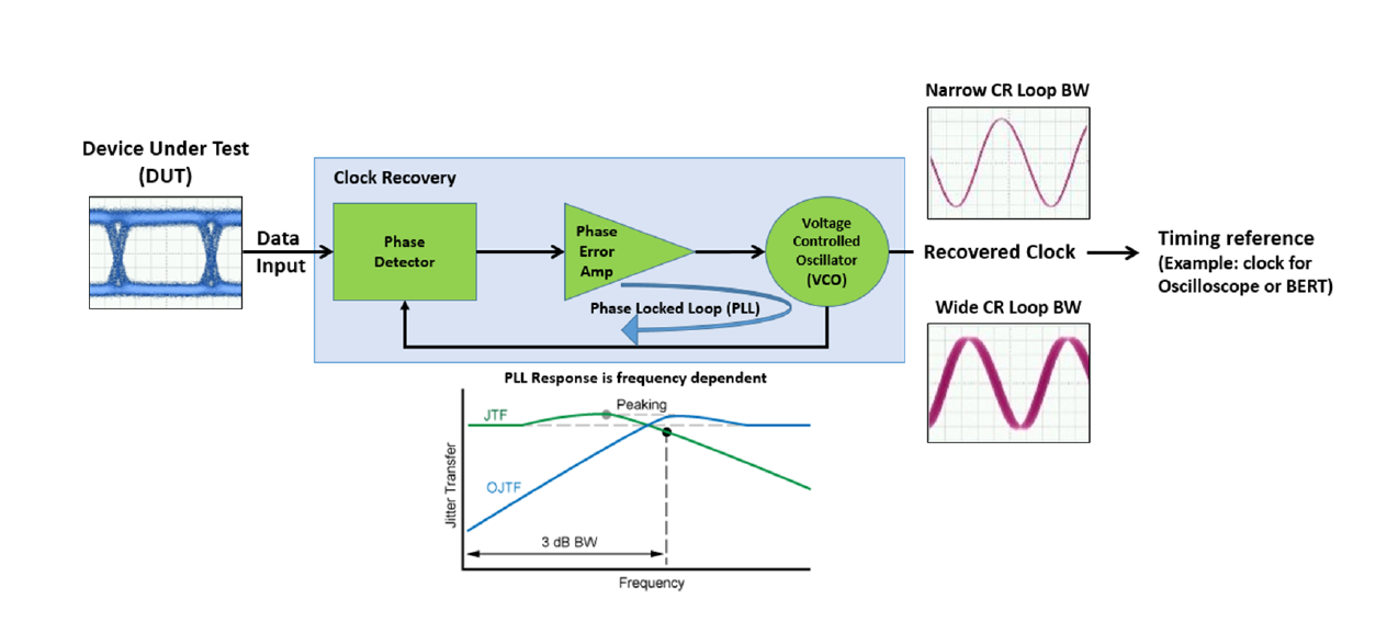 時(shí)鐘恢復(fù)的作用和原理(CDR)。時(shí)鐘恢復(fù)是通過鎖相環(huán)電路將輸入的數(shù)據(jù)或時(shí)鐘信號鎖定,并輸出一個(gè)已恢復(fù)的時(shí)鐘信號。這個(gè)已恢復(fù)的時(shí)鐘信號可以作為示波器或BERT的定時(shí)參考。時(shí)鐘恢復(fù)的性能由鎖相環(huán)電路的帶寬、峰值等參數(shù)決定,這些參數(shù)決定了從輸入信號中出現(xiàn)多少抖動在已恢復(fù)的時(shí)鐘信號上(也稱為抖動傳遞函數(shù))。使用時(shí)鐘恢復(fù)的原因包括滿足標(biāo)準(zhǔn)要求、測試無時(shí)鐘設(shè)備以及提供觸發(fā)信號給示波器或BERT等。N1076B是一種用于電氣信號的儀器級時(shí)鐘恢復(fù)器,可支持高達(dá)64GBd的速度,并具有可調(diào)節(jié)的帶寬和峰值,確保符合標(biāo)準(zhǔn)的時(shí)鐘恢復(fù)能力。該設(shè)備可通過USB連接到N1000A或86100D DCA-X主機(jī)或獨(dú)立PC運(yùn)行N1010A FlexDCA軟件。
