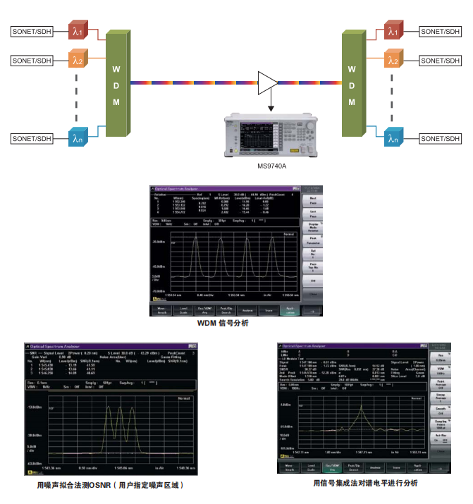 MS9740A在距峰值波長0.2nm外42dB的動態(tài)范圍保證了100GH7和50GH7間隔WDM信號的精確測量。MS9740A最多可分析300個信道的信號,所有WDM 信號分析需要的信息如中心波長、功率、OSNR等都可以顯示在同一界面上。由于具有詳細(xì)的噪聲位置選擇,所以當(dāng)作OSNR分析時,可以選擇兩種估算方法:兩點(diǎn)插入法和噪聲擬合插入法,兩點(diǎn)法可以自動分析Dip點(diǎn),但是到中心波長的距離可以人為指定。