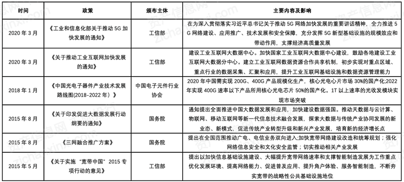 光模塊是現(xiàn)代信息光電子技術(shù)領(lǐng)域核心的光電子器件,應(yīng)用較為廣泛,與數(shù)據(jù)中心、5G承載網(wǎng)的建設(shè)息息相關(guān)。因其重要性,我國政府頒布了一系列相關(guān)政策,支持光模塊產(chǎn)業(yè)的可持續(xù)發(fā)展。在2020年3月,工信部發(fā)布《關(guān)于推動工業(yè)互聯(lián)網(wǎng)加快發(fā)展的通知》,建設(shè)工業(yè)互聯(lián)網(wǎng)大數(shù)據(jù)中心。建立工業(yè)互聯(lián)網(wǎng)數(shù)據(jù)資源合作共享機(jī)制,初步實(shí)現(xiàn)對重點(diǎn)區(qū)域、重點(diǎn)行業(yè)的數(shù)據(jù)采集、匯聚和應(yīng)用,提升工業(yè)互聯(lián)網(wǎng)基礎(chǔ)設(shè)施和數(shù)據(jù)資源管理能力。
