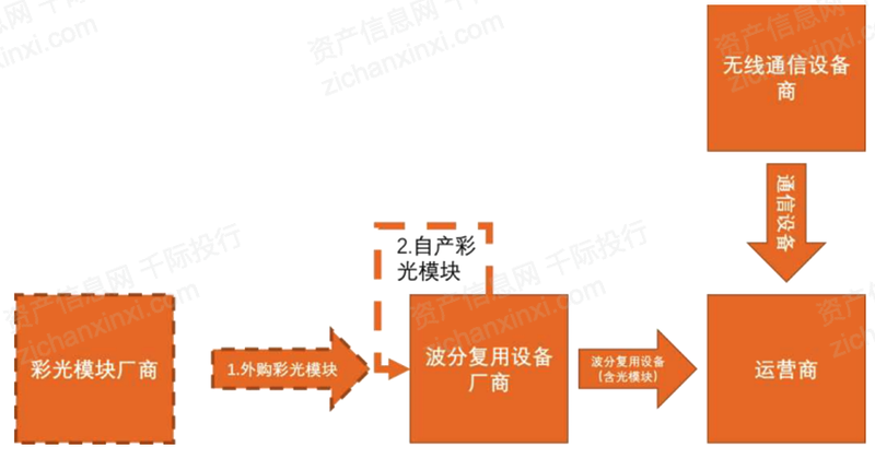 無源波分是彩光模塊在前傳中最主要的應(yīng)用場景。隨著2020年5G基站的規(guī)模建設(shè),作為無線前傳主要解決方案之一,無源波分設(shè)備有望打開市場空間,成為拉動彩光模塊最主要的引擎。近期三大運(yùn)營商已進(jìn)入集團(tuán)公司或者省分公司采購高峰期,其中,2020年中國移動已招標(biāo)采購超過10.6萬套無源波設(shè)備,中國電信集采超15萬套無源波分設(shè)備,這也驗(yàn)證了我們對無源波分方案成為前傳主流方案的判斷。與灰光模塊的由通信設(shè)備商打包銷售的商業(yè)模式不同的是,彩光模塊一般由無源波分設(shè)備商通過自產(chǎn)或者外采的方式獲得,再與波分設(shè)備商所生產(chǎn)的無源波分設(shè)備搭配銷售給運(yùn)營商。