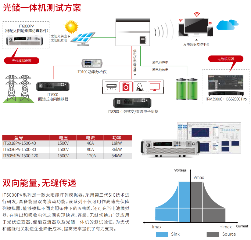 IT6000PV系列是一款太陽能陣列模擬器,具備I-V/P-V曲線仿真功能,能夠模擬各種太陽能電池板在不同環(huán)境條件下(包括溫度、光照、陰影衰減、老化度)的IV輸出特性。該系列具備1500V高壓輸出和快速M(fèi)PPT跟蹤速度,標(biāo)配光伏曲線仿真軟件,可控制多達(dá)20臺(tái)IT6000PV源,實(shí)現(xiàn)多通道MPPT追蹤測(cè)試。廣泛應(yīng)用于并網(wǎng)逆變器、組串式逆變器、光儲(chǔ)一體機(jī)、儲(chǔ)能變流器等測(cè)試驗(yàn)證,為用戶提供高效的測(cè)試解決方案。